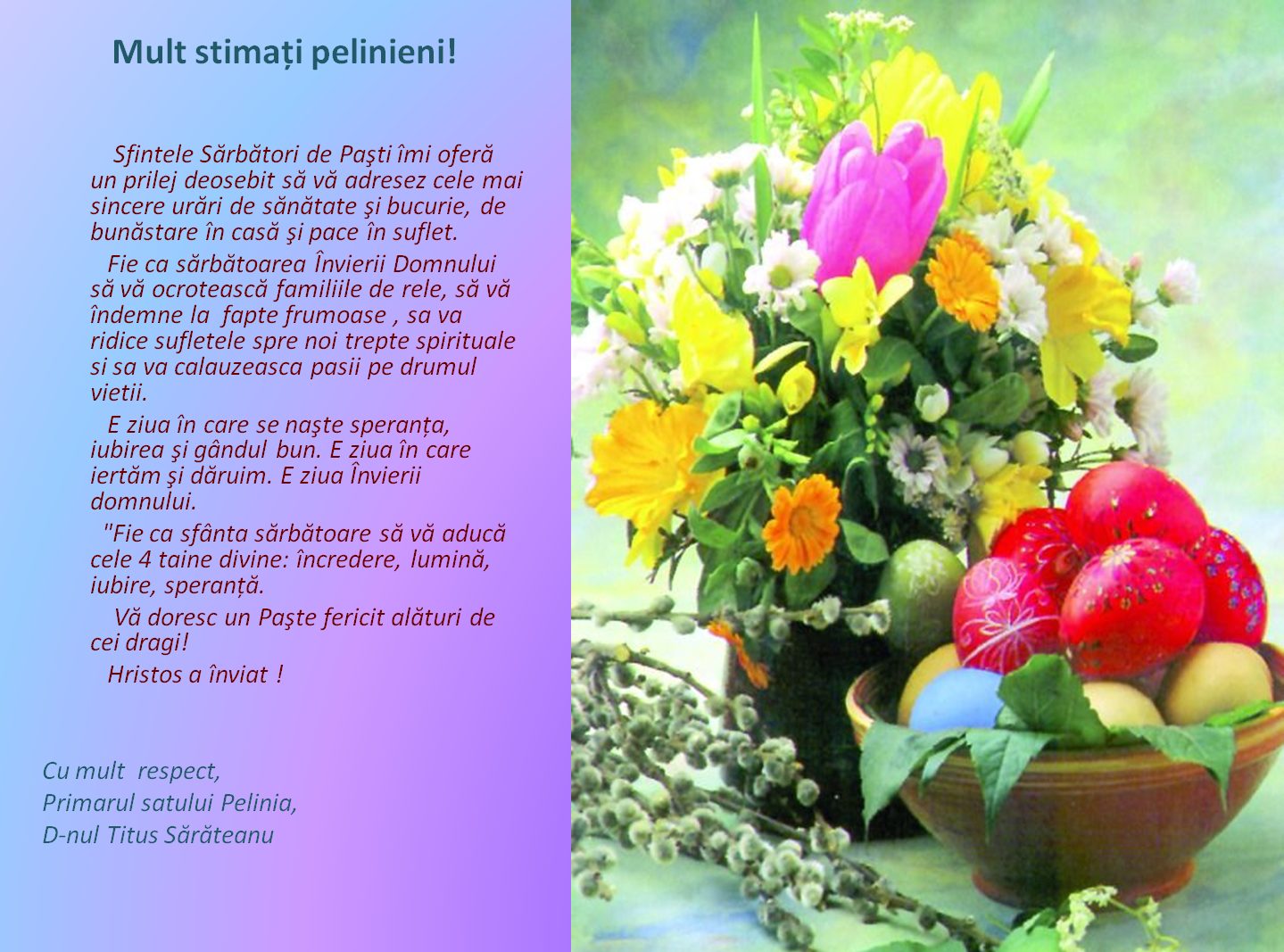 Acasă Felicitări Felicitarea Primarului de PastiFelicitarea Primarului de Pasti14 aprilie 2017231DISTRIBUIȚI Facebook Twitter