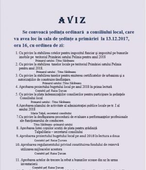 Acasă Anunțuri Ședința ordinară din 13.12.2017 ora 16:00Ședința ordinară din 13.12.2017 ora 16:0011 decembrie 201778DISTRIBUIȚI Facebook Twitter